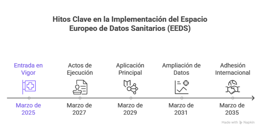 - Marzo 2035: terceros países y organizaciones internacionales podrán solicitar su participación en HealthData@EU para acceder al uso secundario de datos.